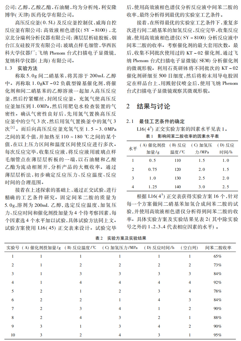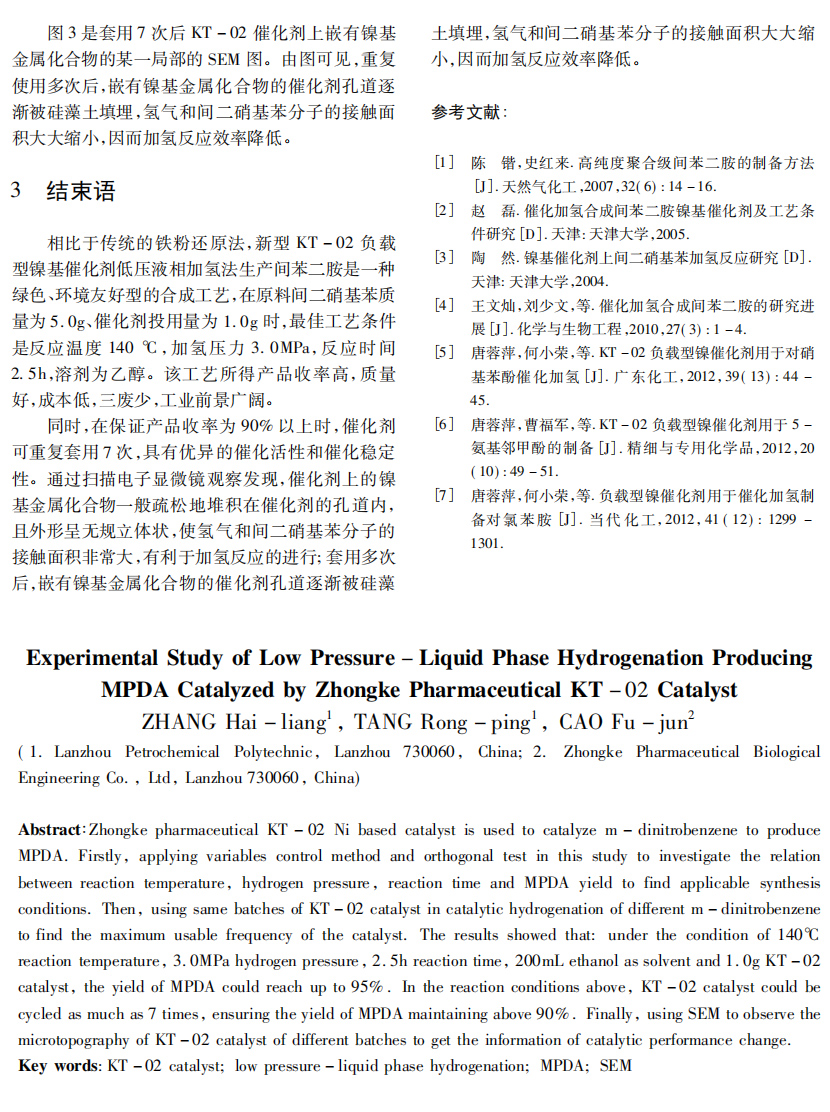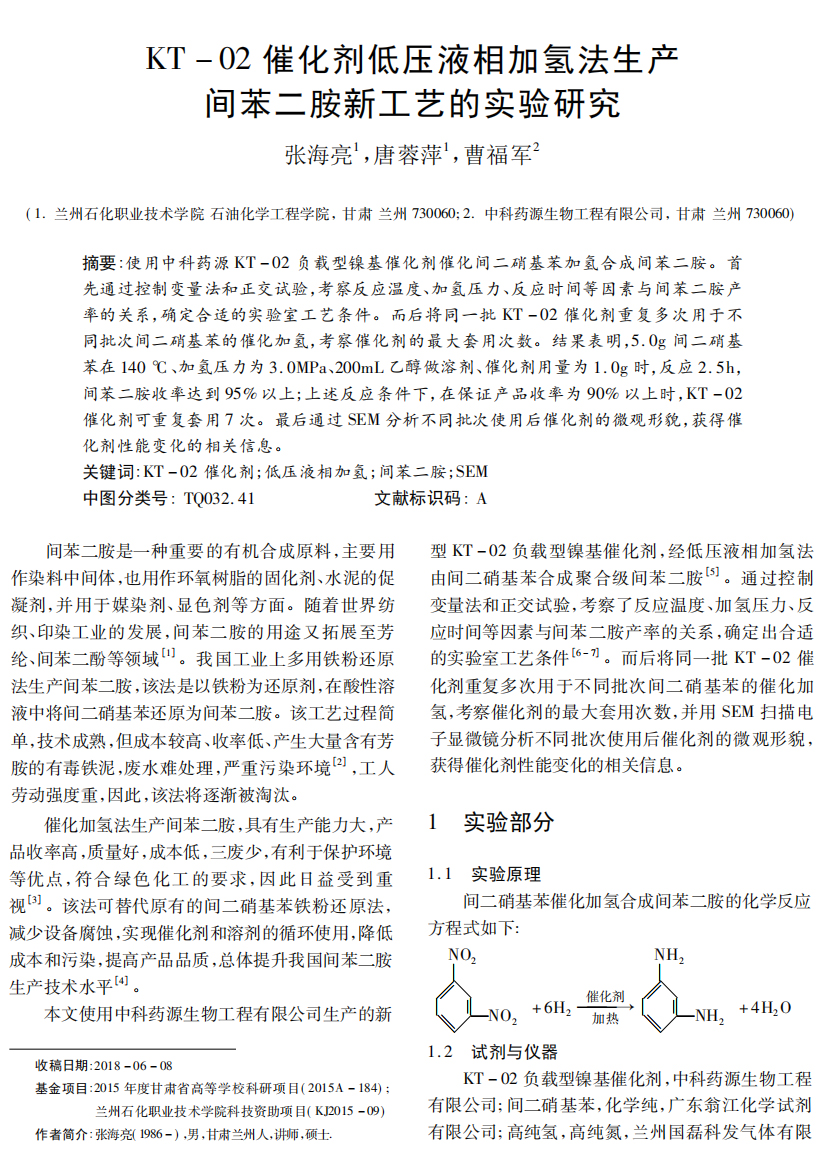 KT-02 催化劑低壓液相加氫法生產(chǎn) 間苯二胺新工藝的實(shí)驗研究